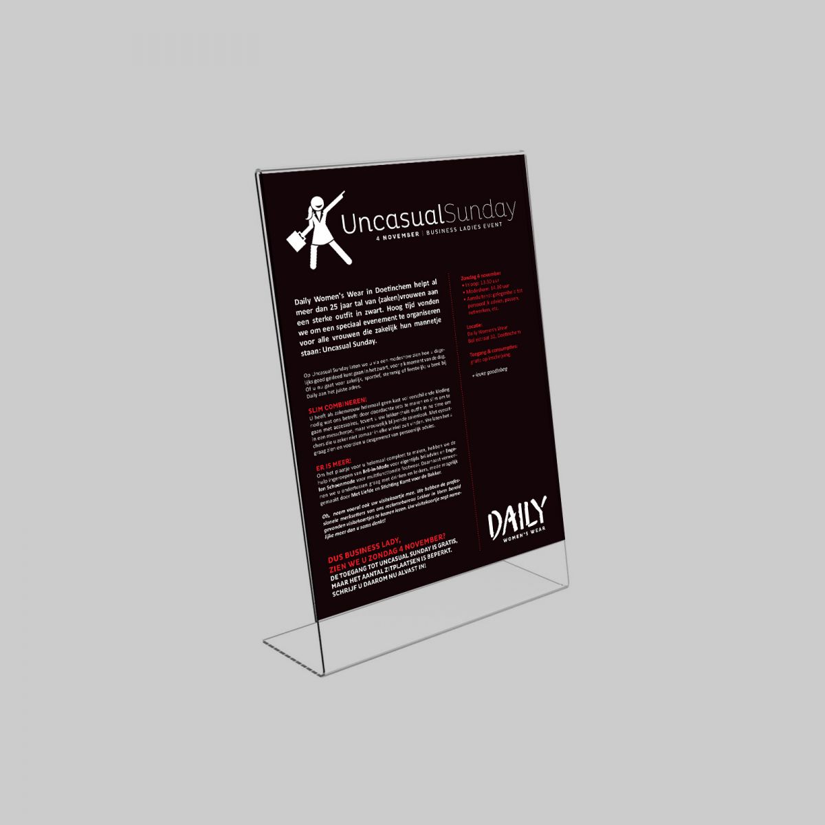 Daily Women’s Wear in Doetinchem helpt al meer dan 25 jaar tal van (zaken)vrouwen aan een sterke outfit in zwart. Hoog tijd vonden we om een speciaal evenement te organiseren voor alle vrouwen die zakelijk hun mannetje staan: Uncasual Sunday. Op Uncasual Sunday laten we u via een modeshow zien hoe u dagelijks goed gekleed kunt gaan in het zwart, voor elk moment van de dag. Of u nu gaat voor zakelijk, sportief, stemmig of feestelijk; u bent bij Daily aan het juiste adres. Slim combineren! U heeft als zakenvrouw helemaal geen kast vol verschillende kleding nodig wat ons betreft: door doordachte sets te maken en slim om te gaan met accessoires, tovert u uw lekker-thuis outfit in no time om in een messcherpe, maar vrouwelijk blijvende zakenlook. Met eyecatchers die u zeker niet zomaar in elke winkel zult vinden. We laten het u graag zien en voorzien u desgewenst van persoonlijk advies. Er is meer! Om het plaatje voor u helemaal compleet te maken, hebben we de hulp ingeroepen van Bril-in-Mode voor eigentijds briladvies en Engelen Schoenmode voor multifunctionele footwear. Daarnaast verwennen we u ondertussen graag met drinken en lekkers, mede mogelijk gemaakt door Met Liefde en Stichting Komt voor de Bakker. Oh, neem vooral ook uw visitekaartje mee. We hebben de professionele merksetters van ons reclamebureau Lekker in Vorm bereid gevonden visitekaartjes te komen lezen. Uw visitekaartje zegt namelijke meer dan u soms denkt! Dus business lady, zien we u zondag 4 november? De toegang tot Uncasual Sunday is gratis, maar het aantal zitplaatsen is beperkt. Schrijf u daarom nu alvast in!