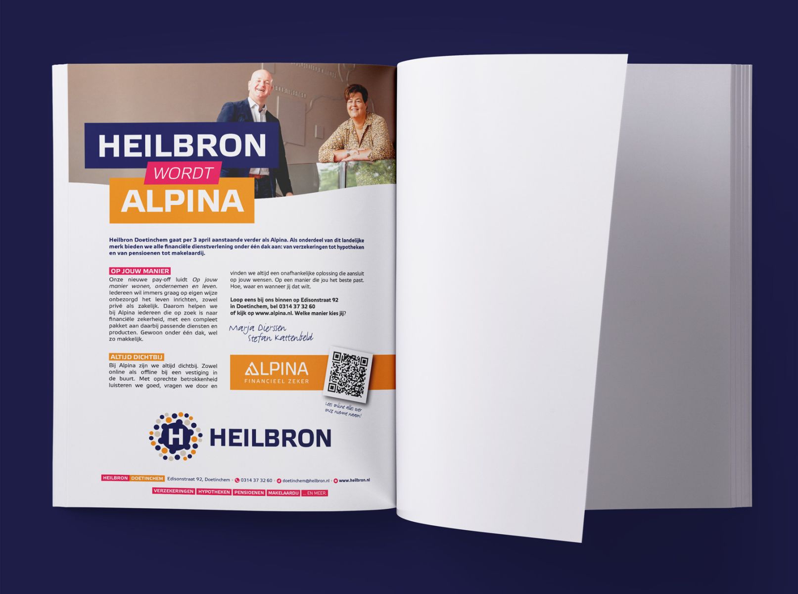 De komende tijd maakt de naam Heilbron in heel Nederland plaats voor de nieuwe naam Alpina. Voor de diverse vestigingen mochten we bij lekker in vorm items ontwikkelen voor de bijbehorende naamswijzigingscampagne. Denk hierbij aan diverse mailings en advertenties vóór en ná de naamswijziging.