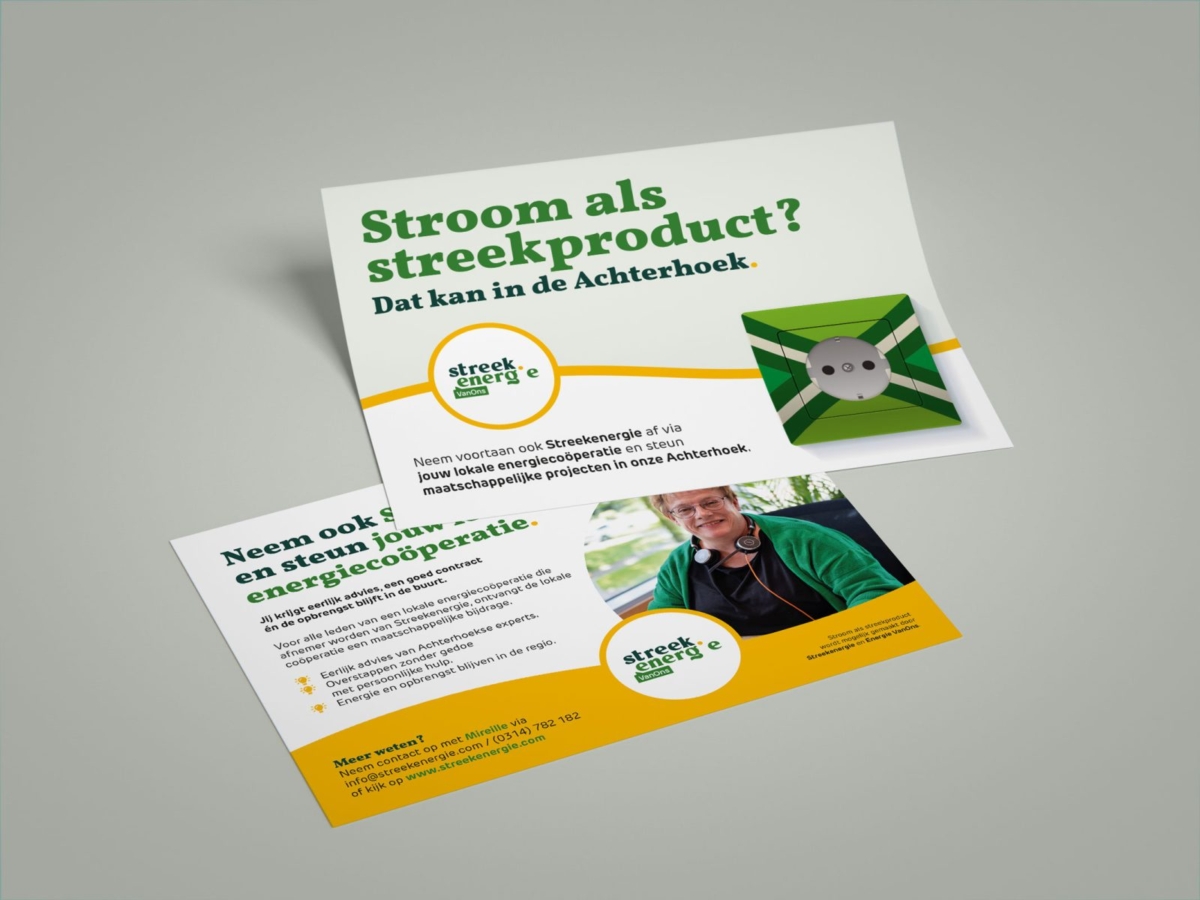 Ook het drukwerk is flexibel ingericht. De coöperaties zijn vrij om dit zelf te regelen, maar als het via ons loopt, levert dat extra voordeel op: we kunnen slim combineren in een gezamenlijke drukgang – dat bespaart energie én kosten. Uiteraard drukken we op milieuvriendelijk papier, zodat de uitvoering perfect aansluit op het merkverhaal van Streekenergie.
