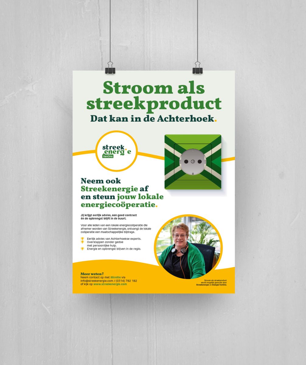 Met de boodschap “Stroom als Streekproduct? Dan kan in de Achterhoek.” gaven we Streekenergie en de aan hun verbonden lokale energiecoöperaties een wervende poster en flyers om hun achterban te bewegen over te stappen op stroom uit de streek en zo maatschappelijke projecten in de regio te steunen.