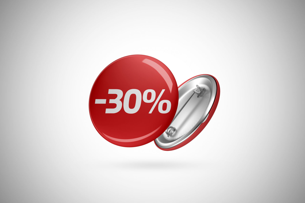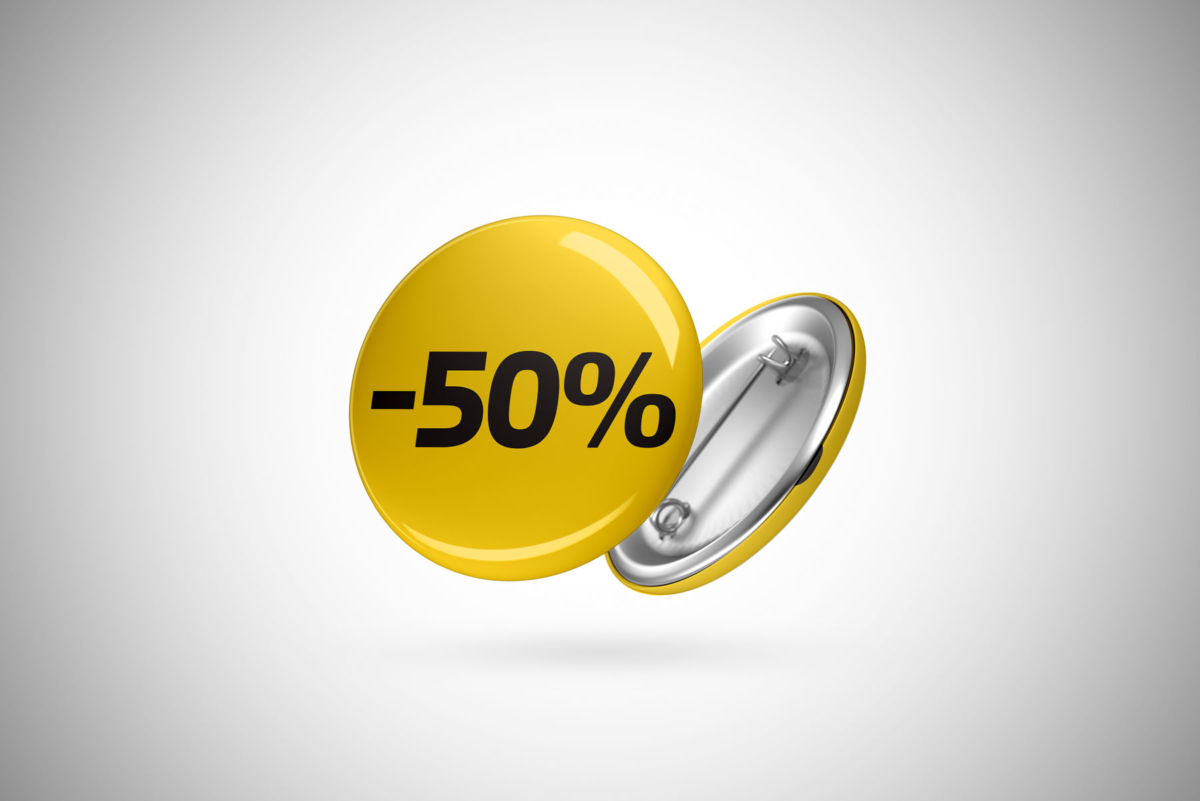 Wij doken erin. Op maat gemaakte tape bleek in kleine oplage lastig uitvoerbaar, relatief kostbaar en beperkt herbruikbaar. Dus bedachten we een slimmere en duurzamere aanpak: we vonden standaard bedrukt SALE-tape en combineerden dit met custom buttons met het kortingspercentage.