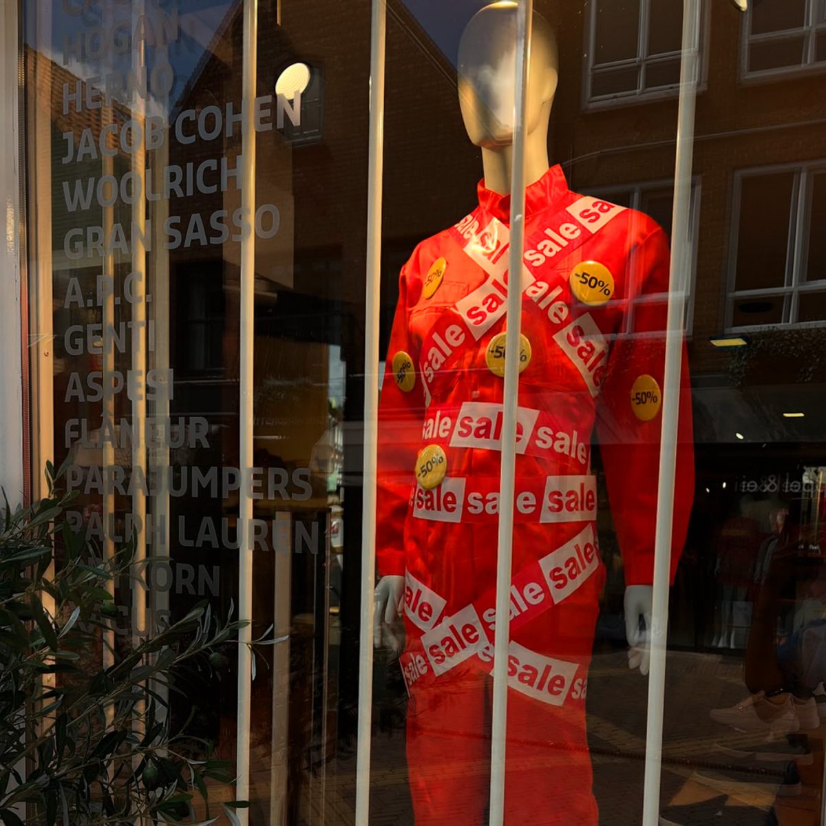 Eigenaar Jurgen van T-Time wilde de SALE dit keer graag in worker-thema gieten – inclusief oranje overalls die al klaarlagen. Zijn idee: de paspoppen met overalls aan inwikkelen met SALE-tape met daarop kortingspercentages.