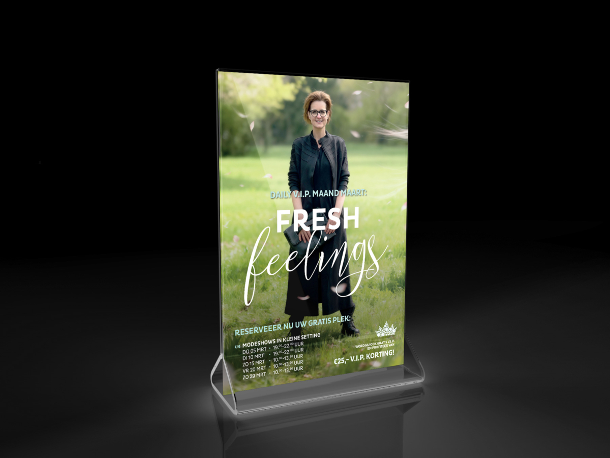 Voor Daily Women’s Wear in Doetinchem mochten we ook dit voorjaar weer een volledige VIP-campagne ontwikkelen. Ditmaal onder het thema Fresh Feelings: een naam die meerdere ladingen dekt. Het verfrissende karakter van de nieuwe voorjaarscollectie, het lentegevoel dat zich aandient, én de verse merken zoals NÜ Denmark en KHEI die een podium krijgen tijdens deze editie.