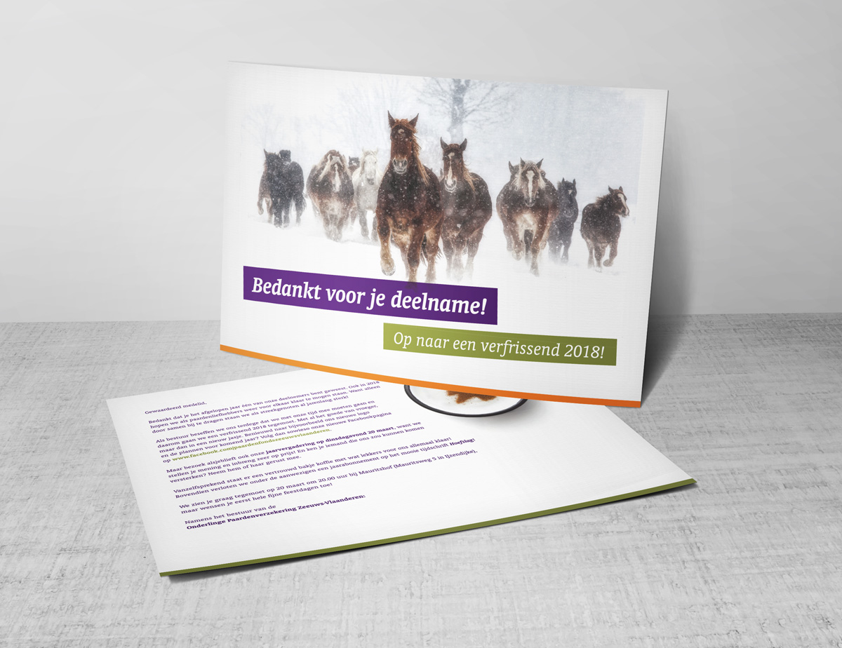 Om alle deelnemers van het Onderling Paardenfonds Zeeuws-Vlaanderen te bedanken voor hun deelname het afgelopen jaar ontwierp lekker in vorm een eindejaarskaart die de bestuursleden af kunnen geven tijdens de jaarlijkse paardenkeuring. Het ontwerp toont alvast een voorproefje van de nieuwe huissitjl van het fonds. Alle leden worden dan ook van harte uitgenodigd voor de jaarvergadering in maart, waarop het nieuwe logo en de nieuwe huisstijl officieel zullen worden onthuld.