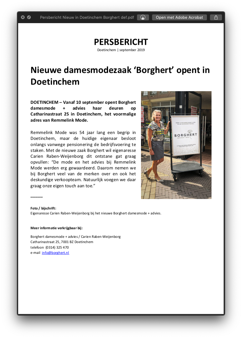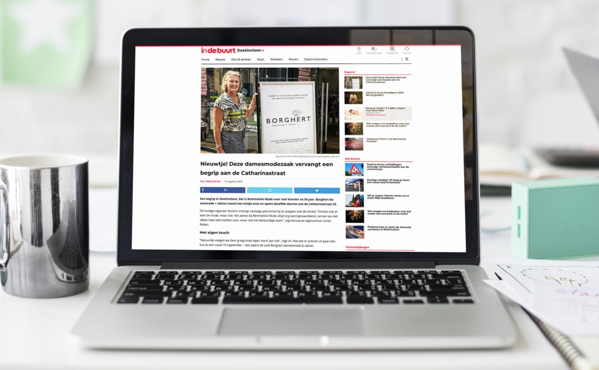 De opening van een damesmodezaak in hartje Doetinchem mag natuurlijk niet onopgemerkt blijven. Daarom schreven we bij lekker in vorm een pakkend persbericht voor Borghert en verstuurden we deze mét foto naar diverse lokale nieuwsmedia.