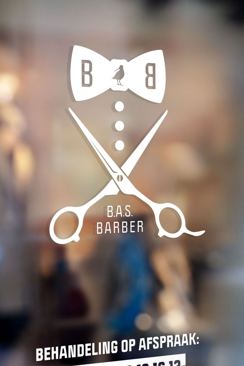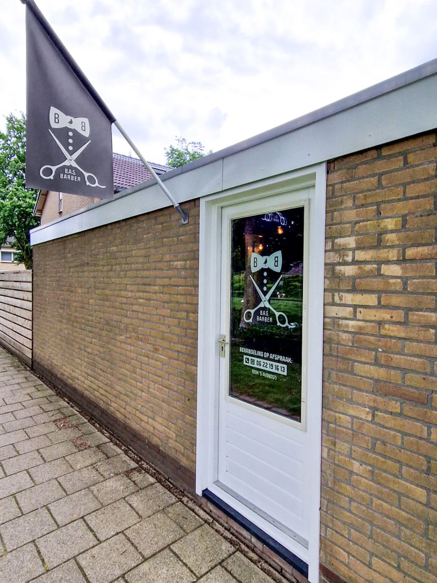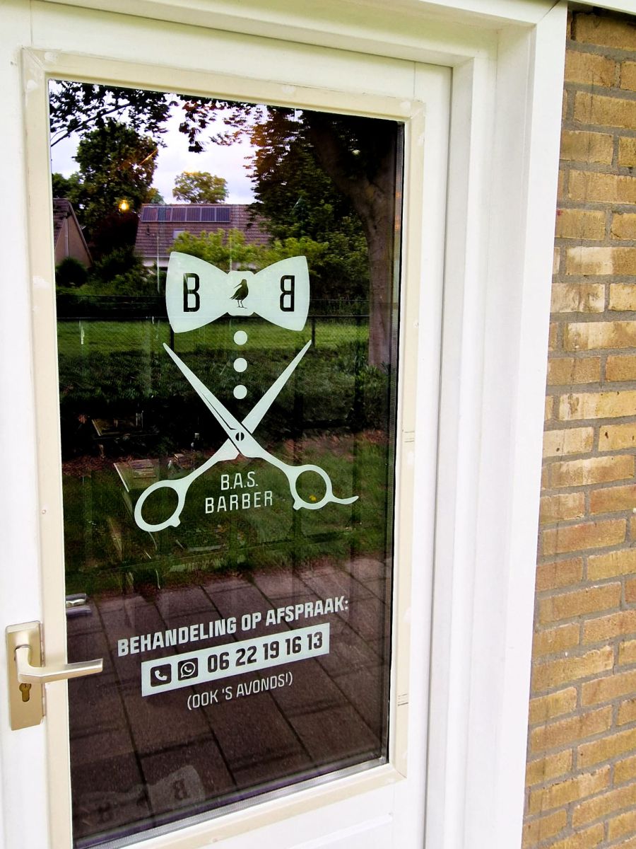 Naast een kioskvlag mochten we voor de zichtbaarheid van Bas Barber raambelettering ontwerpen en verzorgen, uitgesneden uit wit Oracal folie. Zo is voor bezoekers en toevallige passanten niet te missen dat er zich achter de deur een heuse barbershop bevindt. En voor het eenvoudig maken van een afspraak buiten kniptijden staat Bas telefoon-/whatsappnummer er ook bij vermeld.
